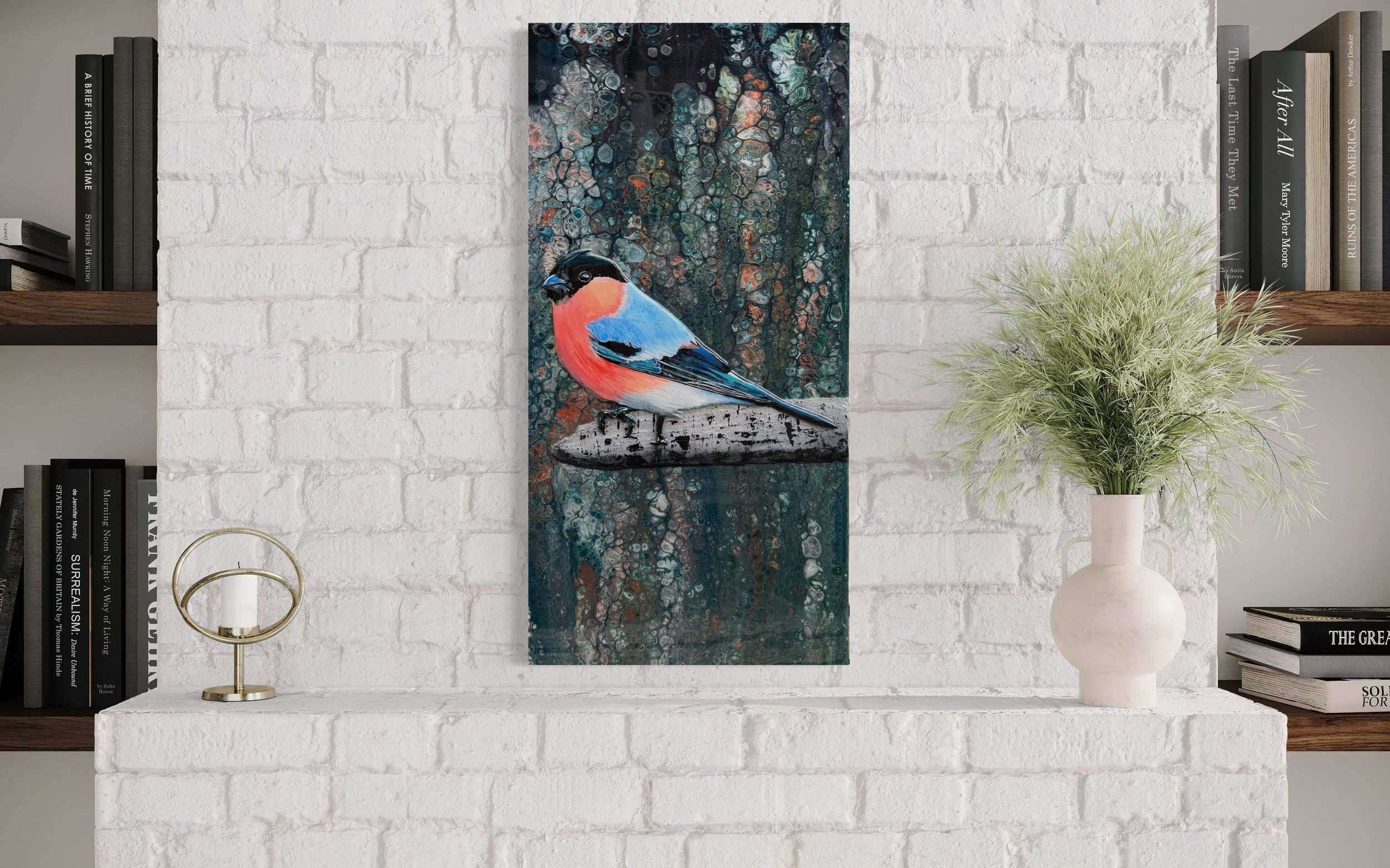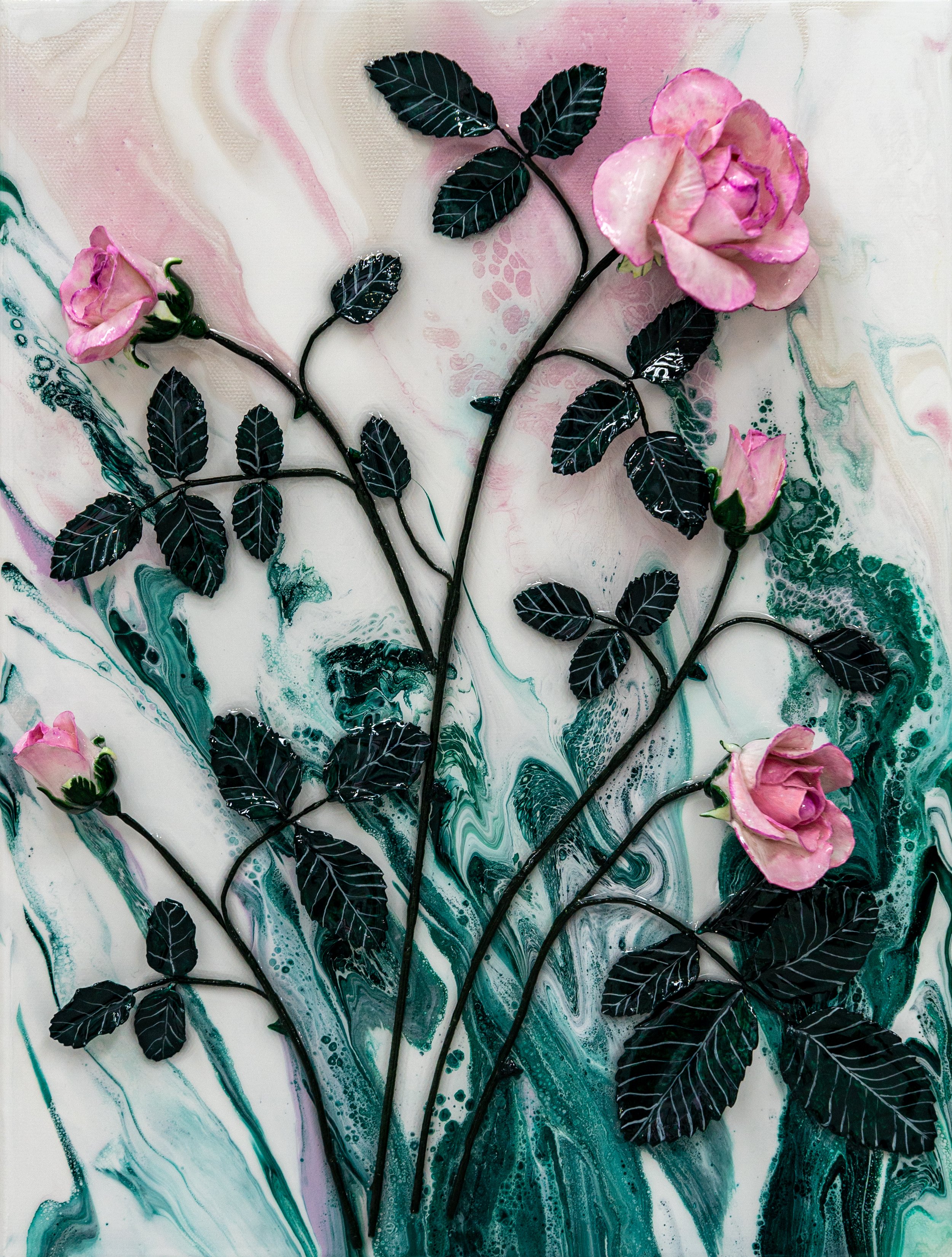 My creative process is layered and intuitive, combining fluid art, sculptural elements, resin and mixed media to allow movement, interaction and chance to shape each piece before being refined by hand. Colour, texture and depth are central to the work, with translucent layers and a final resin finish enhancing luminosity and creating an immersive, tactile surface.