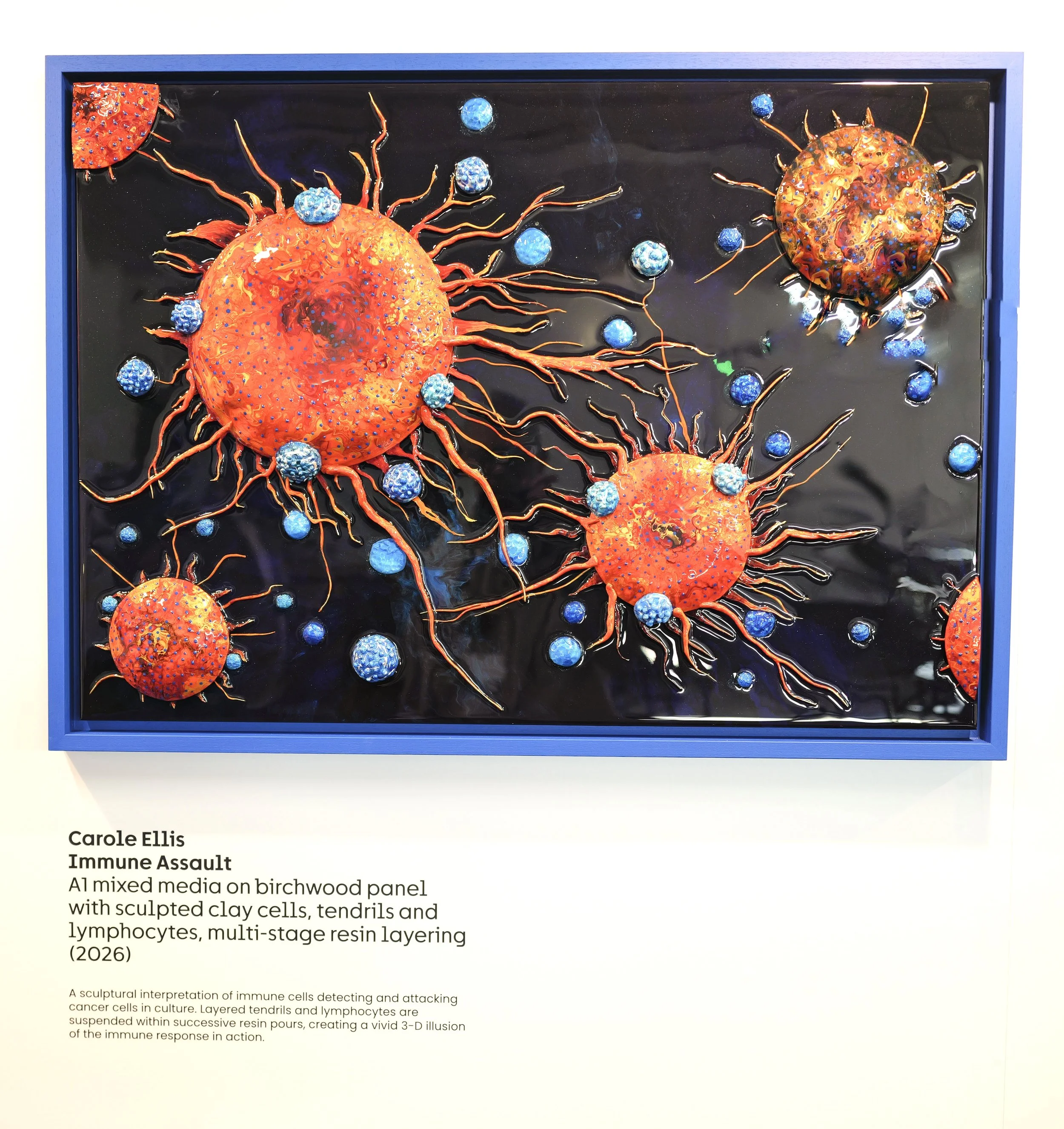This artwork reimagines the moment immune cells recognise and target cancer cells in culture. The large orange cancer cells and their invasive tendrils extending outward are sculpted in 3-D clay, their surfaces created using a fluid cellular technique echoing their biological texture. Surrounding them, sculpted lymphocytes—immune cells that patrol the body—activate in response to the abnormal cancer cells. The immune attack builds across multiple resin layers: flatter tendrils and lymphocytes are embedded first, a second tier rises above them, and the largest lymphocytes finally emerge from the uppermost layer. This creates a deep, immersive 3-D illusion of immune activation. Set against a dark Winsor blue and Prussian-blue ground, the work transforms a microscopic biological event into a dramatic sculptural landscape of recognition, targeting and destruction.