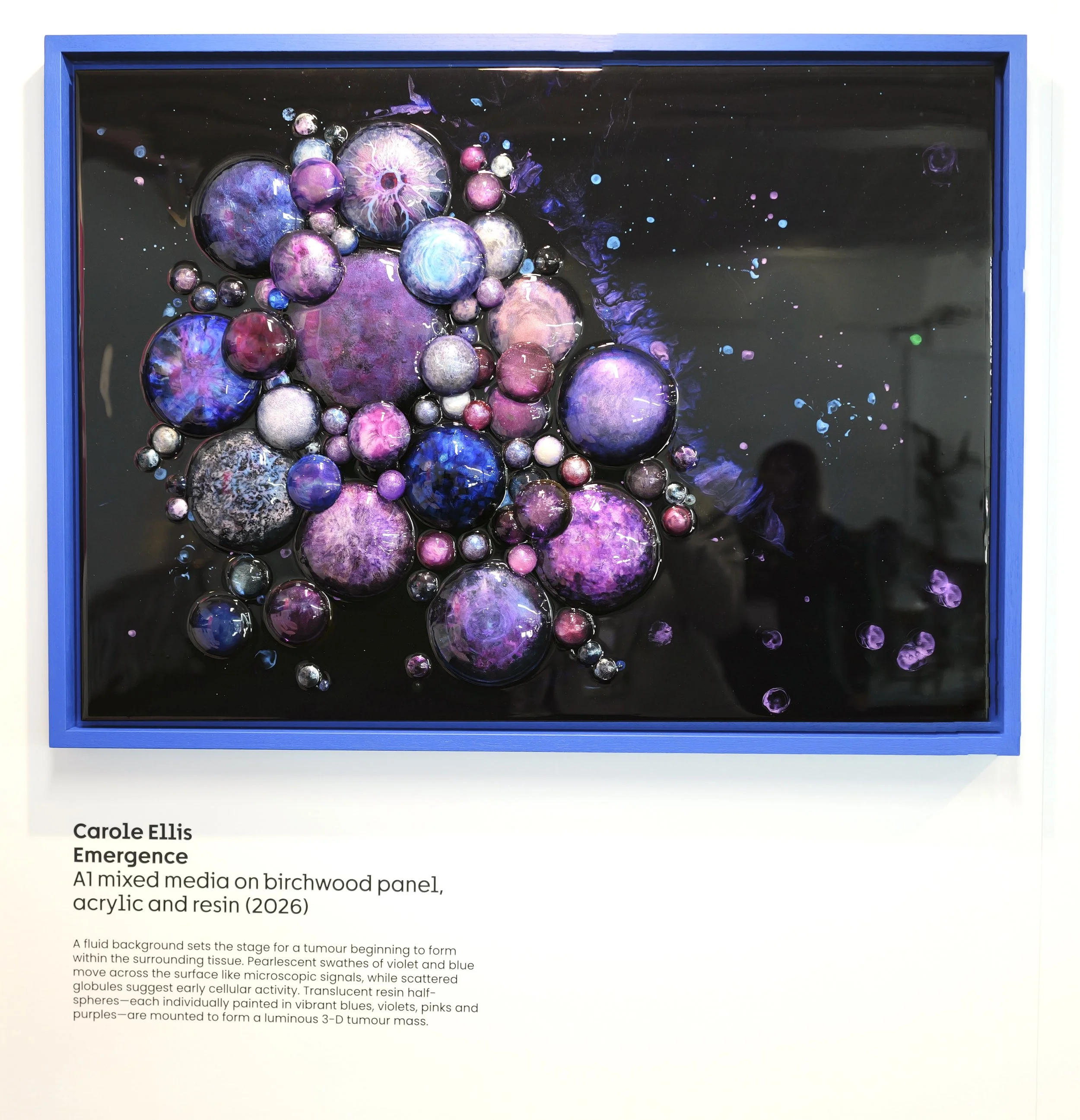A fluid black ground sets the stage for a tumour beginning to form within the surrounding tissue. Pearlescent swathes of violet and blue move across the surface like microscopic signals, while scattered globules suggest early cellular activity. Translucent resin half-spheres—each individually painted in vibrant blues, violets, pinks and purples—are mounted to form a luminous three-dimensional tumour mass.