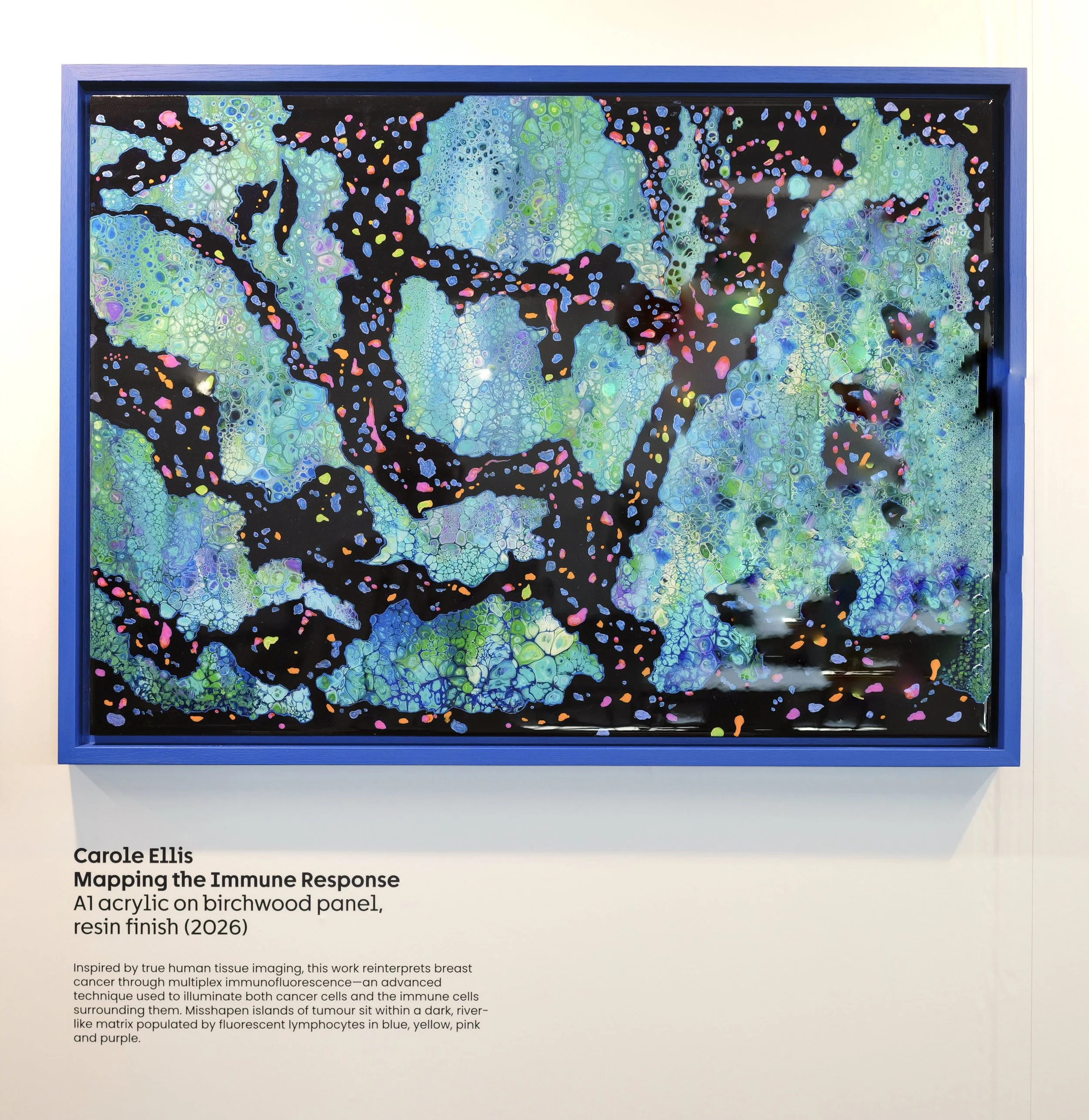 Inspired by true human tissue imaging, this work reinterprets breast cancer through multiplex immunofluorescence—an advanced technique used to illuminate both cancer cells and the immune cells surrounding them. Misshapen islands of tumour sit within a dark, river-like matrix populated by fluorescent lymphocytes in blue, yellow, pink and purple.