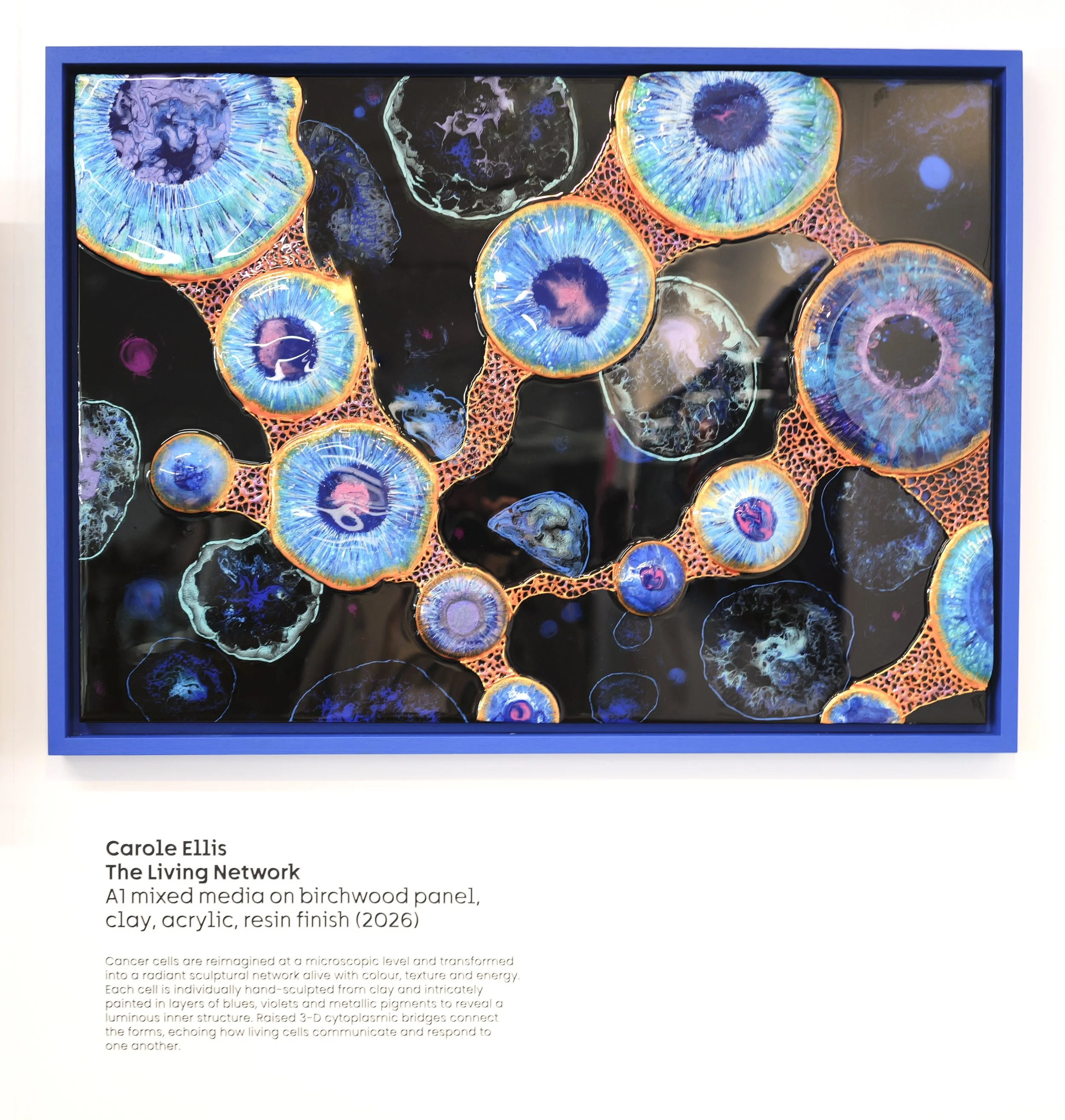 Cancer cells are reimagined at a microscopic level and transformed into a radiant sculptural network alive with colour, texture and energy. Each cell is individually hand-sculpted from clay and intricately painted in layers of blues, violets and metallic pigments to reveal a luminous inner structure. Raised 3-D cytoplasmic bridges connect the forms, echoing how living cells communicate and respond to one another.