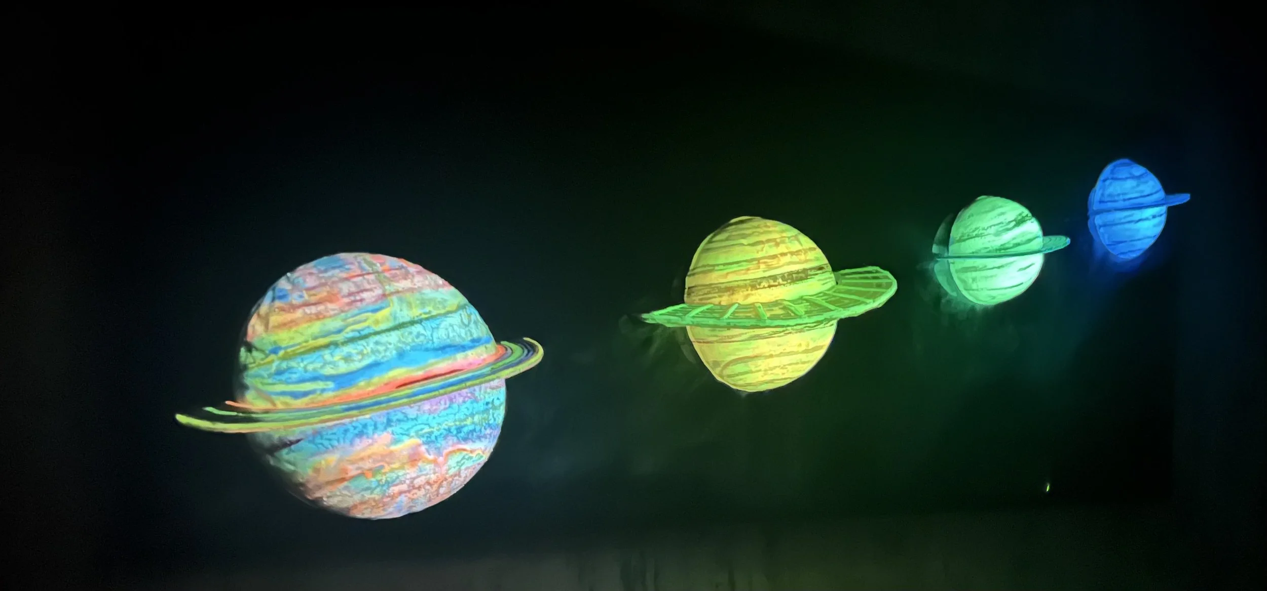 Each planet is constructed from hollow clay—a significant feat in itself—allowing for volume without excessive weight while maintaining structural integrity. The surfaces are meticulously painted using glow-in-the-dark pigments, following extensive testing and comparison of different paint brands to achieve luminosity without compromising colour depth or surface texture. Under shifting light conditions, the planets subtly transform, reinforcing the sense of constant motion and change inherent in the cosmos.